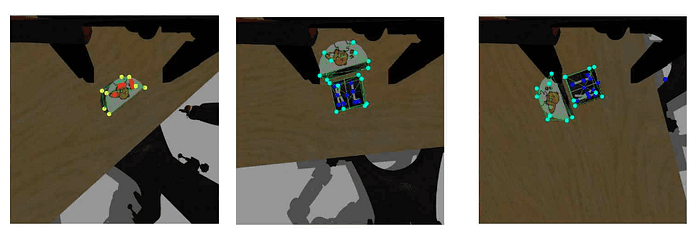 R2D2 network를 이용하여 새로운 camera view에서 찍은 이미지에서의 keypoint를 얻을 수 있습니다. 이제, 새로 얻어낸 keypoint 들과 model registration 과정을 통해 얻은 keypoint 의 matching을 통해 새로 얻어낸 keypoint에 대응하는 object 좌표계에서의 3차원 위치를 얻을 수 있습니다.