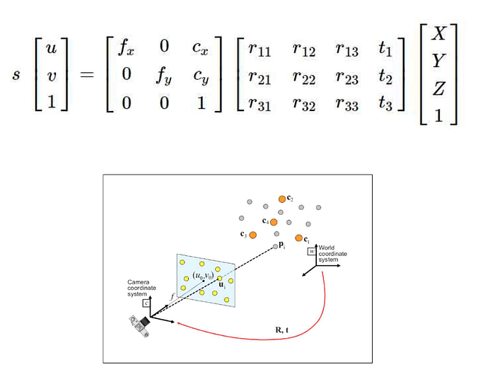 먼저, world 좌표계와 카메라를 통해 얻은 2d좌표사이의 관계에 대해 알아보겠습니다. 카메라를 이용하여 사진을 찍는다는 것은 world 좌표(X,Y,Z) 를 특정 2d 평면의 한점(u,v)으로 projection 시키는 것이라고 할 수 있습니다. 이 때, world 좌표와 2d 좌표 상에는 다음과 같은 matrix multiplication 관계가 존재하며, 각각은 camera parameter, world 좌표계와 camera 좌표계 사이의 rotation 및 translation 를 의미합니다.