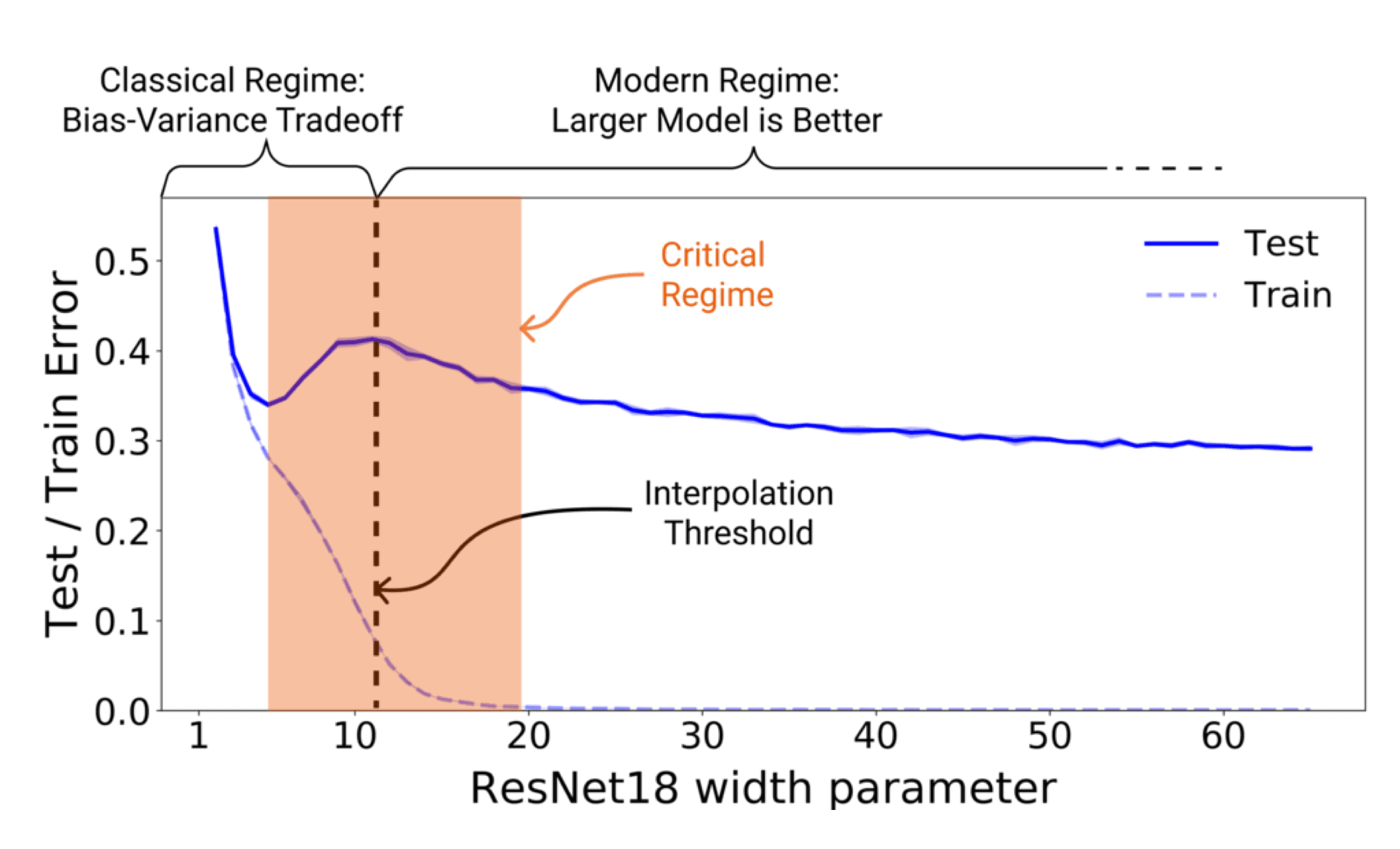 이 논문이 제시하는 가설은, 모델의 크기에 따른 에러의 크기는 단순히 계속 좋아지거나, 계속 나빠지는 것이 아니라 위의 그래프와 같이 double descent의 형태를 띠게 된다는 것, 그리고 이때 트레이닝 과정에 따라 결정되는 모델의 Interpolation Threshold에 따라 critical regime(에러가 peak을 찍는 부분)의 위치를 대략적으로 예측할 수 있다는 것이다. 이런 현상을 좀더 formal하게 표현하기 위해서는 다음의 개념이 필요하다.