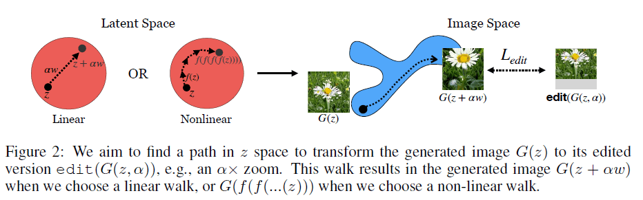 예를 들어 아래 그림의 edit함수가 zoom이라고 하자. 논문에서 제안한 학습과정을 통해서 zoom을 담당하는 vector w를 찾을 수 있고, latent vector z에서 w의 방향으로 alpha step만큼 가서 generator로 이미지를 생성하면 (G(z+aw)) 원하던 zoom된 이미지를 얻을 수 있다. Nonlinear walk의 경우에는 aw만큼 이동하는게 아니라 f라는 함수를 n번 씌워준다.