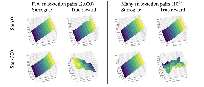 Fig 5. Sample 개수에 따른 Optimization landscape과 true reward landscape의 비교. Step 0에는 두 landscape이 비슷한 경향성을 보인다. 하지만, 학습이 진행되면서 Step 300에는 2k개의 state-action pair로는 Surrogate function이 reward function의 proxy가 되지 못한다는 것을 보여준다.