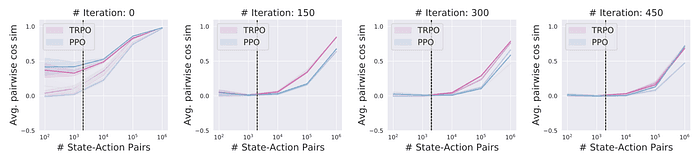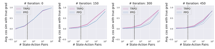 Figure 2. Sample 개수에 따른 sampled gradient와 true gradient 사이의 평균 cosine similarity. PPO에서 어느 정도 유의미한 similarity(cos similarity>0.5, 사이각 60도 이하)를 보이려면 적어도 ¹⁰⁵개 정도의 샘플은 필요하다는 것을 알 수 있다.