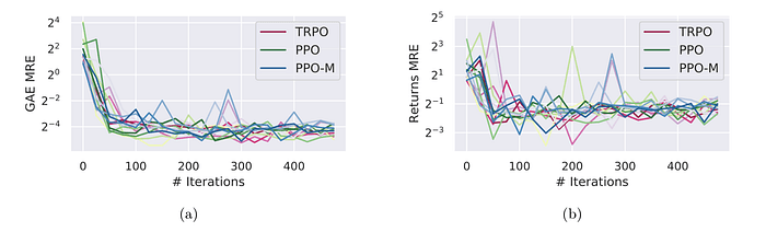 Figure 3. Iteration에 따른 (biased) GAE(a), (unbiased) Return(b) loss. 그림을 보면 어느 쪽으로 보아도 잘 학습하는 것으로 보인다.