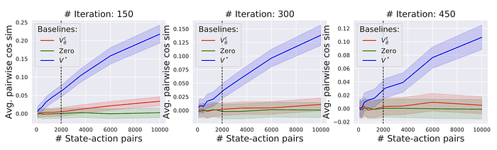 Figure 4. Sample 개수에 따른 sampled gradient의 pairwise cosine similiarity(높을수록 variance가 적다). 파랑, 초록, 빨강은 각각 True Value function, 0(영함수), 우리가 사용하는 Value estimation function이다. 그림에서 볼 수 있듯이 Variance를 어느 정도 줄여주고 있다.