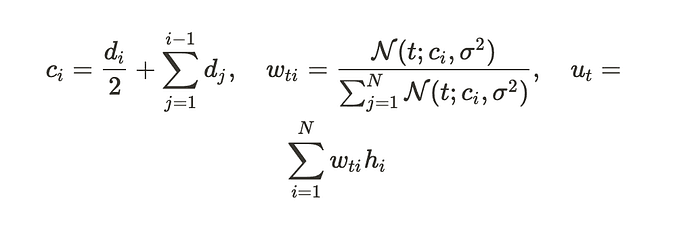 특정 token의 decoder time(t) 에서의 중심 위치©를 계산하여 mean으로 사용하고, σ는 duration과 h를 input으로 하는 network를 거쳐 학습한다.