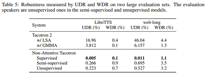 Robustness와 관련하여 UDR(Unaligned Duration Ratio)에서는 상당히 좋은 성능을 보인다. 이 measure는 Tacotron 2과 Non-attentive tacotron 방식을 구분하여 보는 것이 좋을 듯 하다.