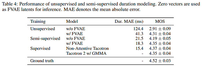 semi-supervised(평가 화자만 duration label이 없음)는 FVAE를 사용하지 않아도 높은 성능을 보이며, FVAE를 사용하면 supervised와 유사한 성능을 보임.
