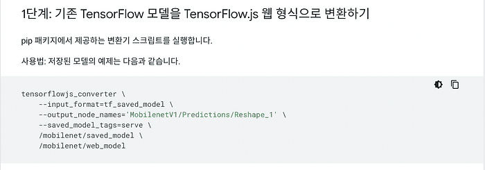 TF 모델 웹 모델 변환 로직Tensorflow JS는 Tensorflow에서 학습된 모델을 쉽게 변환할 수 있습니다. 간단한 명령어를 통해 학습된 모델을 변형시킬 수 있으며, 다만 지원하지 않은 연산들이 있는 경우 Custom Operator를 구현해야 합니다. 그러나 거의 모든 범용적인 연산자들이 Tensorflow JS에 구현되어 있기에 해당 이슈는 크게 없을 것이라 생각됩니다. 간단한 터미널 커맨드를 사용하여 Tensorflow 모델을 손쉽게 변환시킬 수 있습니다.