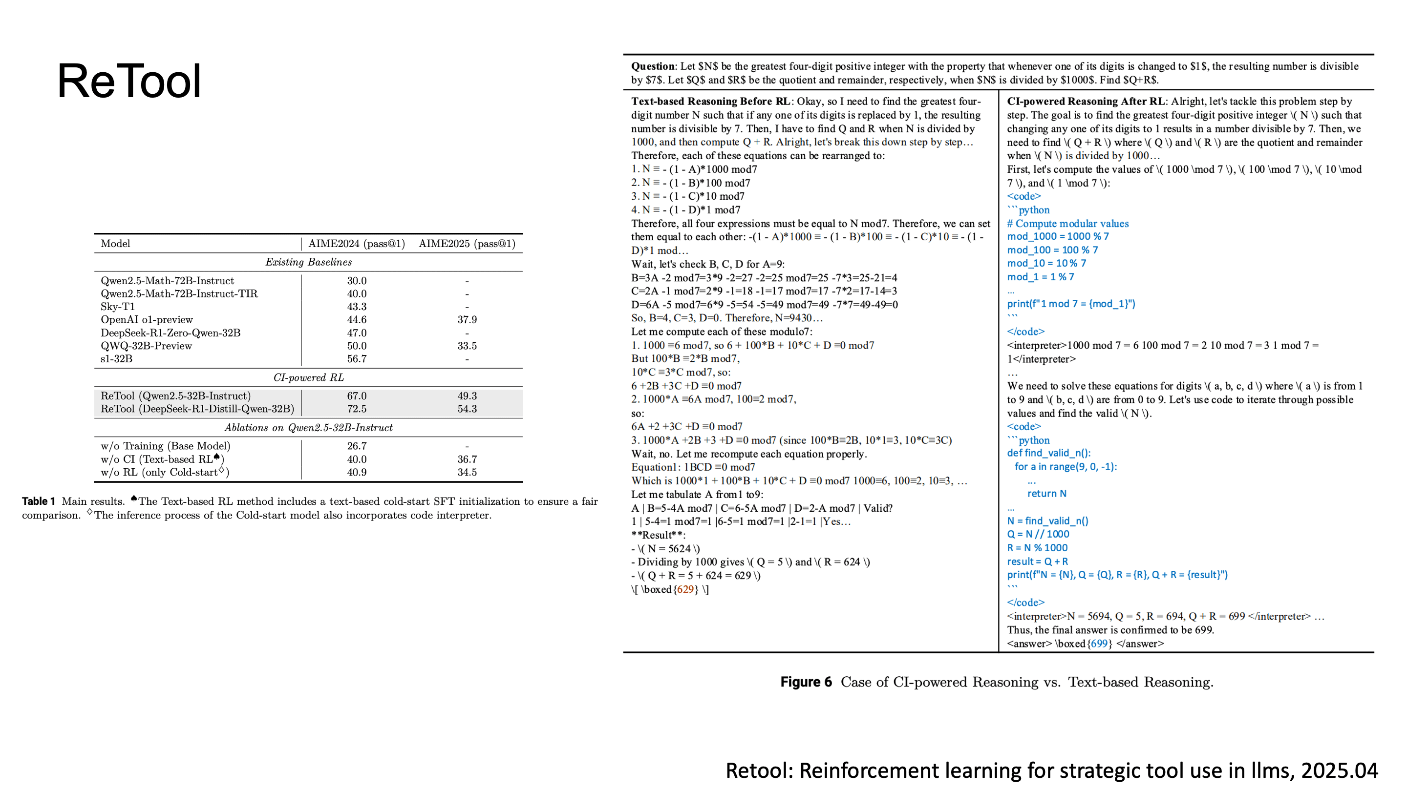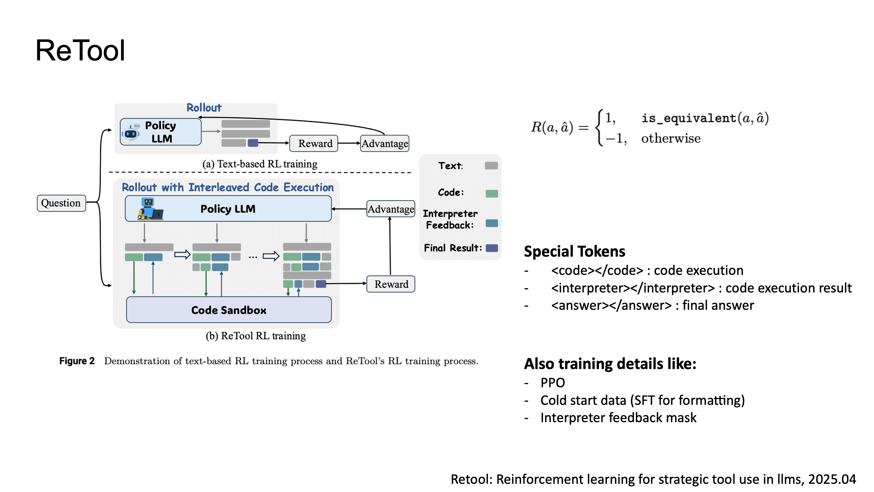 ReTool은 tool-integrated reasoning을 RL로 학습시키는 framework입니다.