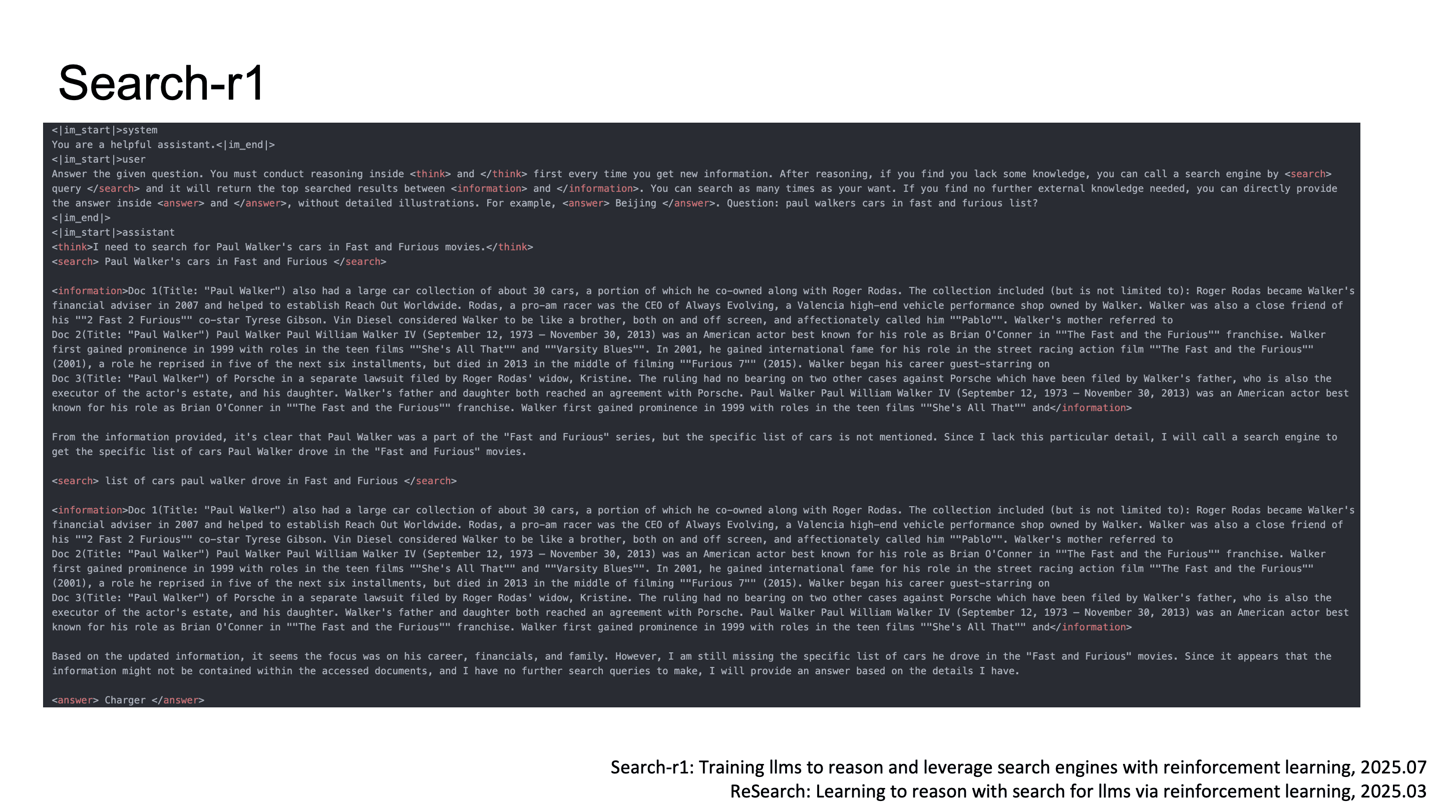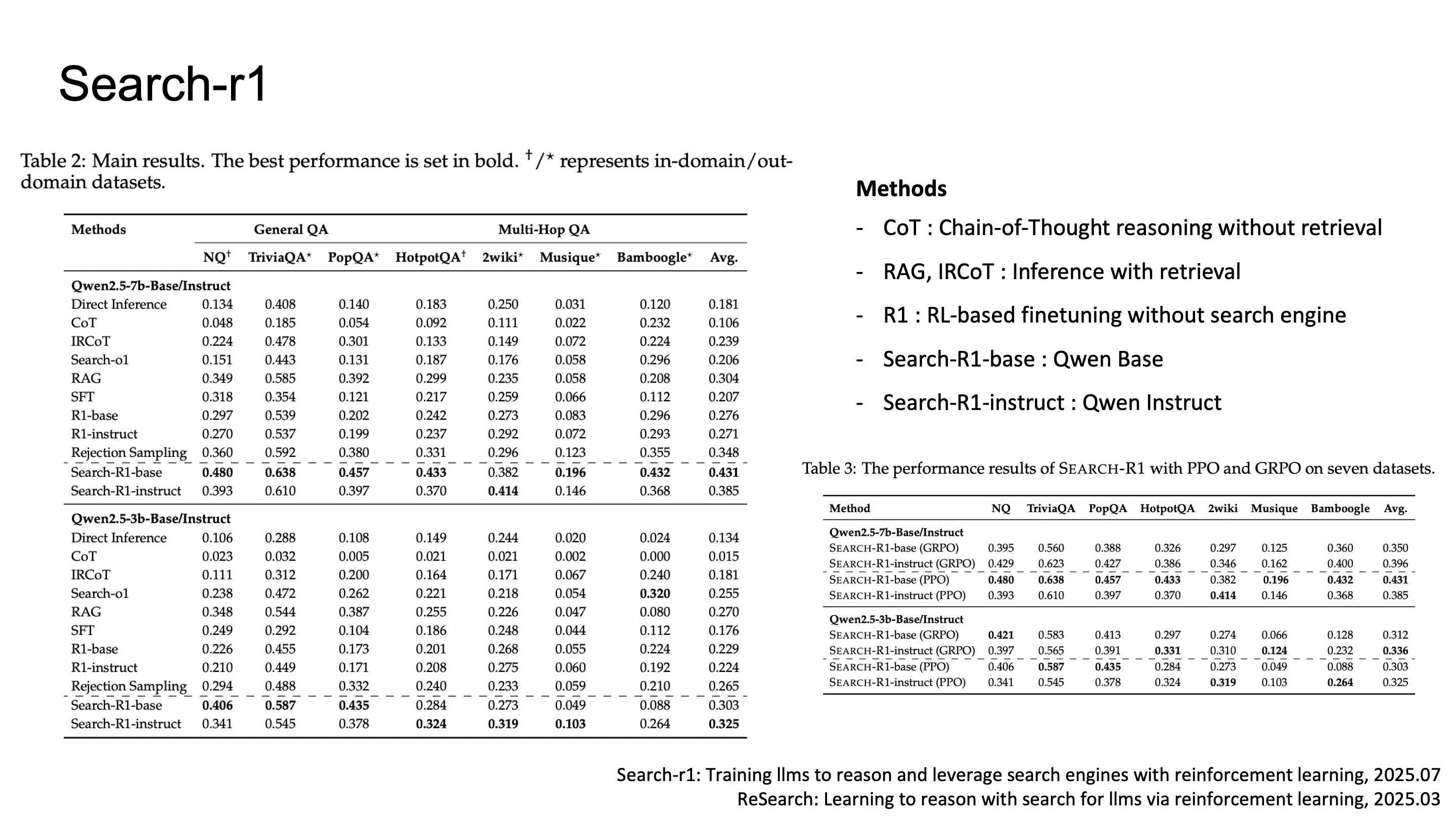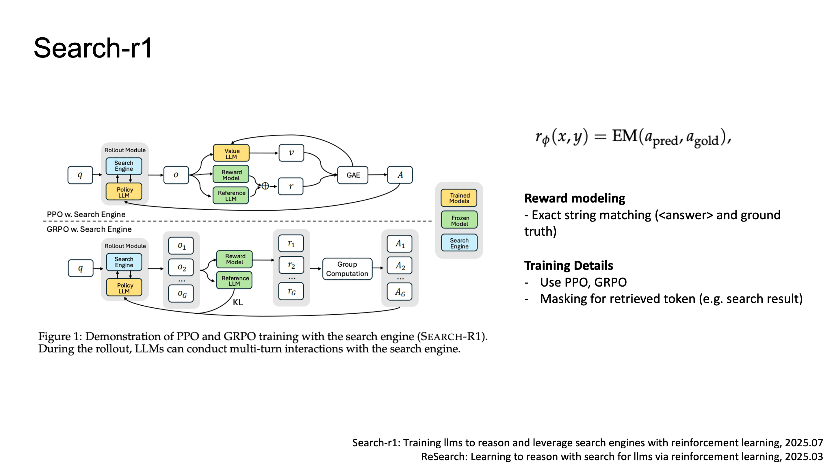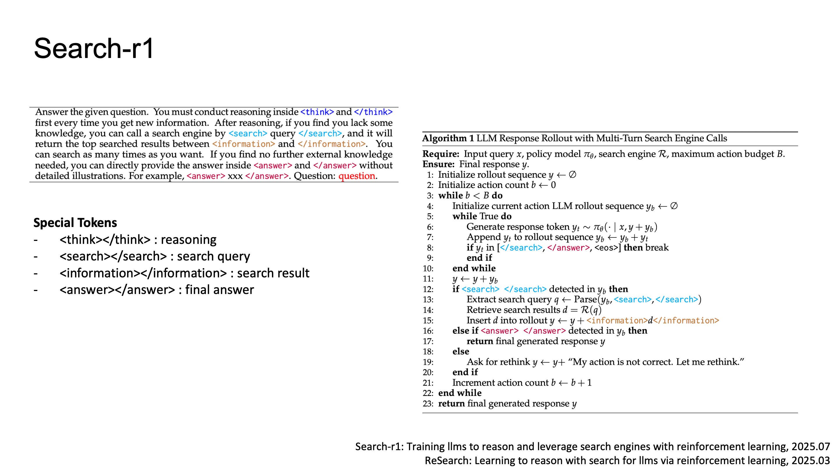 Search-R1 논문은 LLM이 직접 search query를 생성하고, search engine을 tool로 호출하는 전체 과정을 end-to-end RL로 학습시키는 방법을 제안했습니다.
