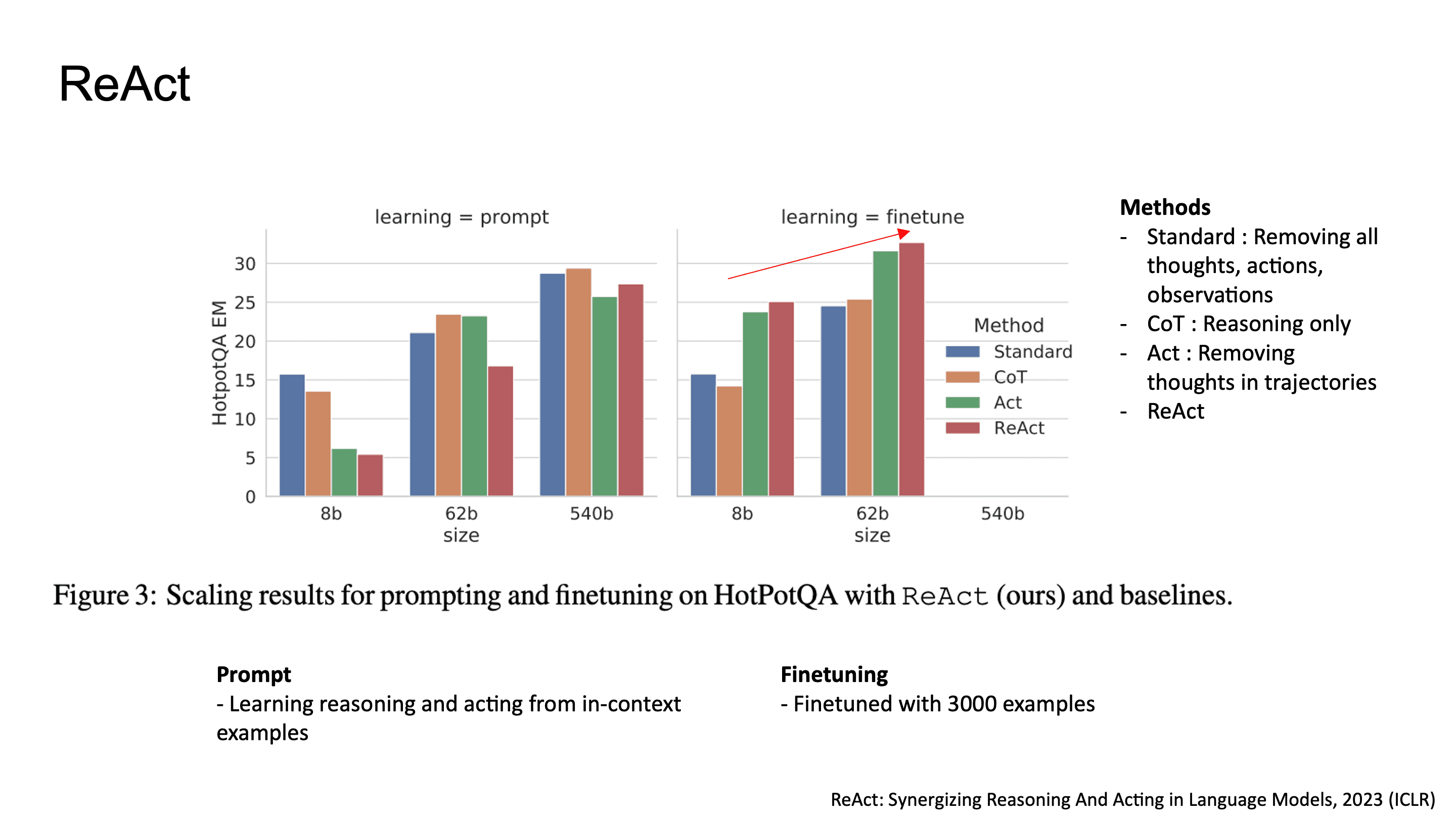 ablation에서 ReAct는 Standard(no thought, no action), CoT-only(reasoning만), Act-only(action만)와 비교했는데, finetuning까지 거쳤을 때 ReAct의 성능이 다른 방법에 비해 차이가 나는 것을 볼 수 있습니다.