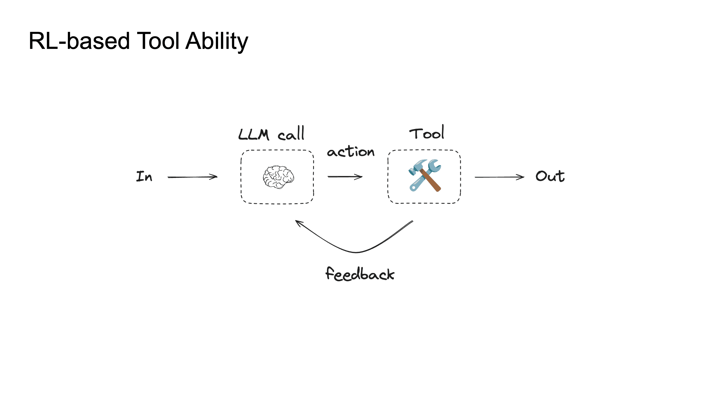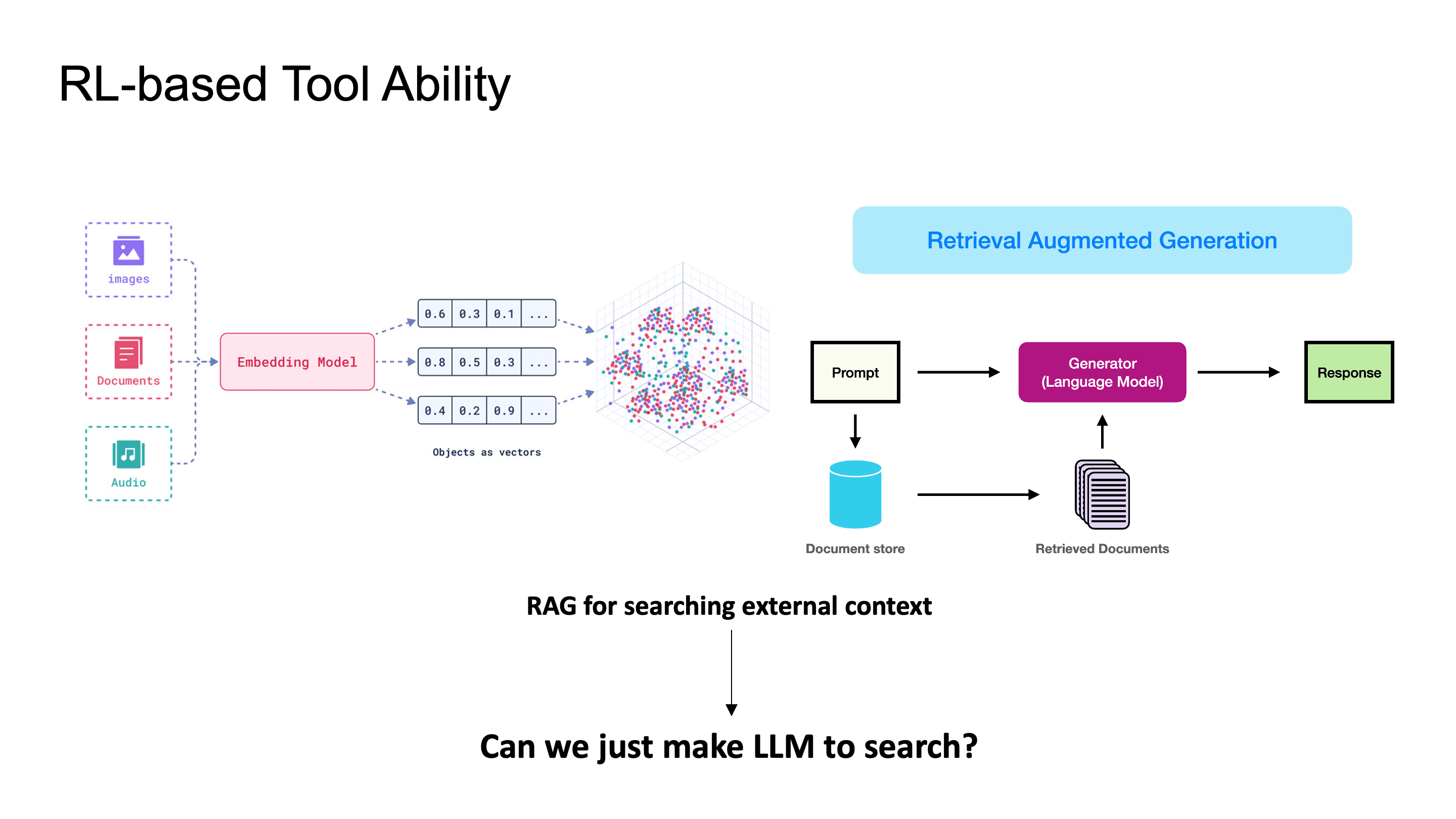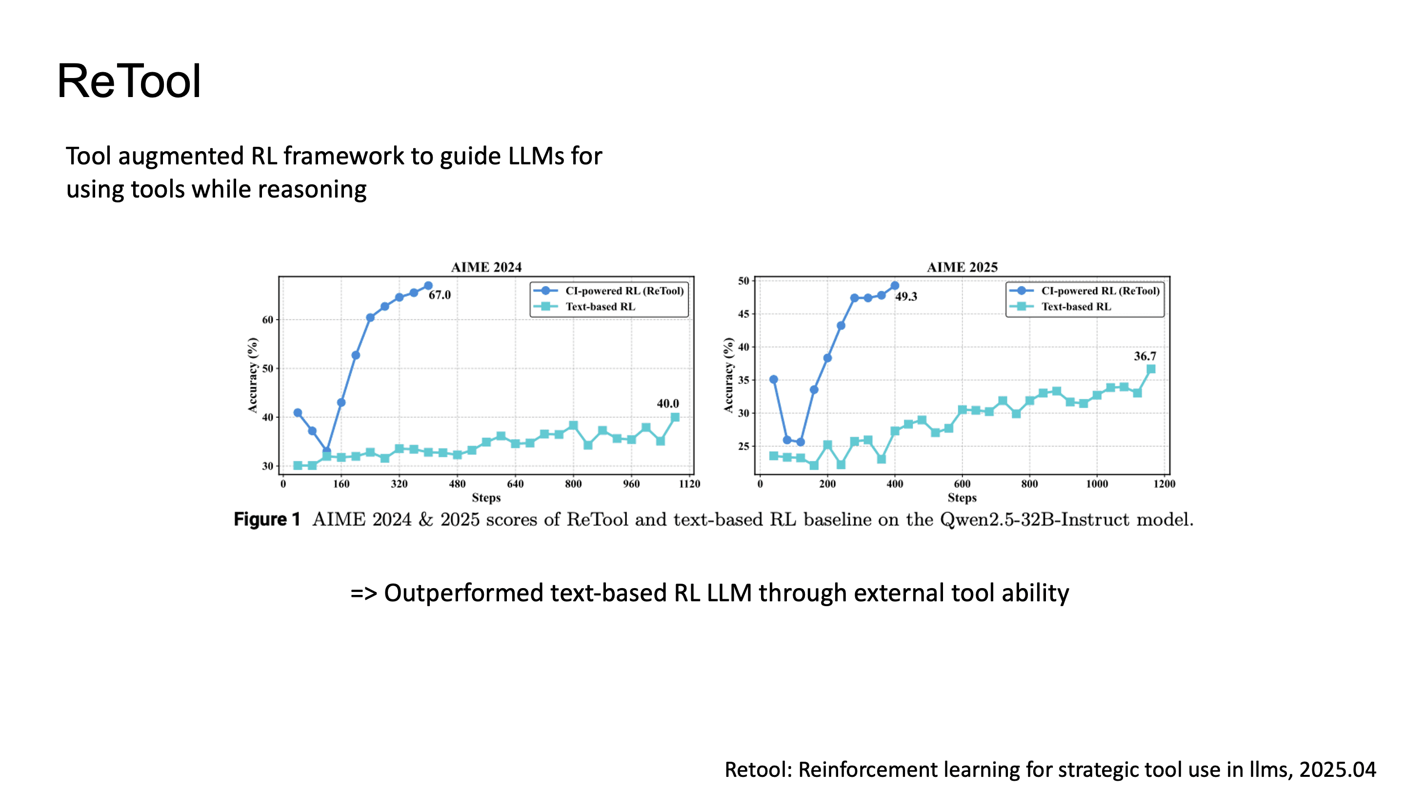 Tool ability를 더 끌어올리기 위해서 강화학습을 사용할 수도 있습니다. Tool-use의 경우 tool execution result가 자연스러운 reward signal이 됩니다. 코드를 실행하면 정답이 나오거나 에러가 나고, 검색하면 relevant document가 나오거나 garbage가 나오니까요. 이걸 RL의 reward로 활용하면, SFT의 distribution shift 문제를 넘어서 on-policy에서 optimal tool-use strategy를 학습할 수 있습니다.