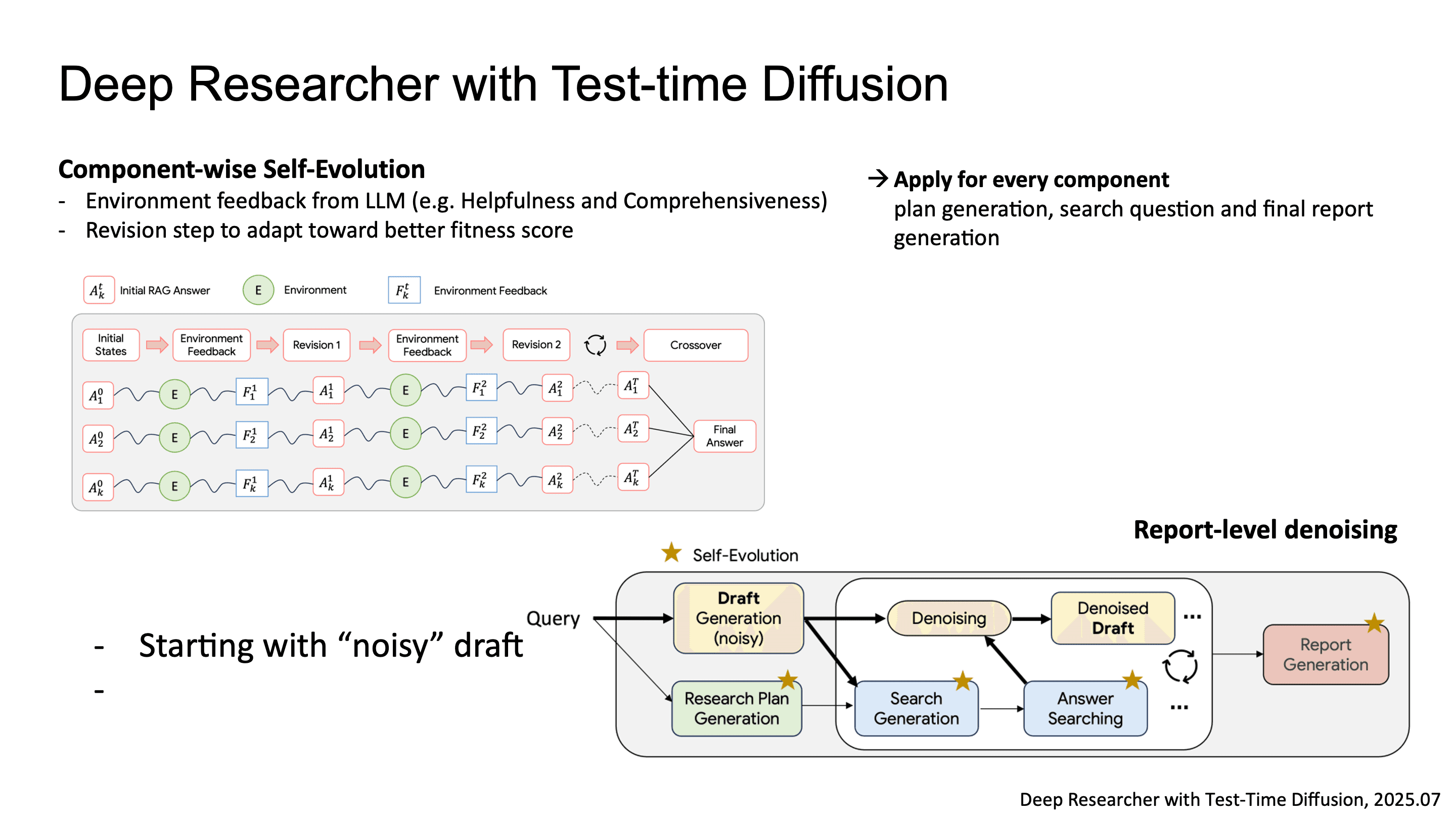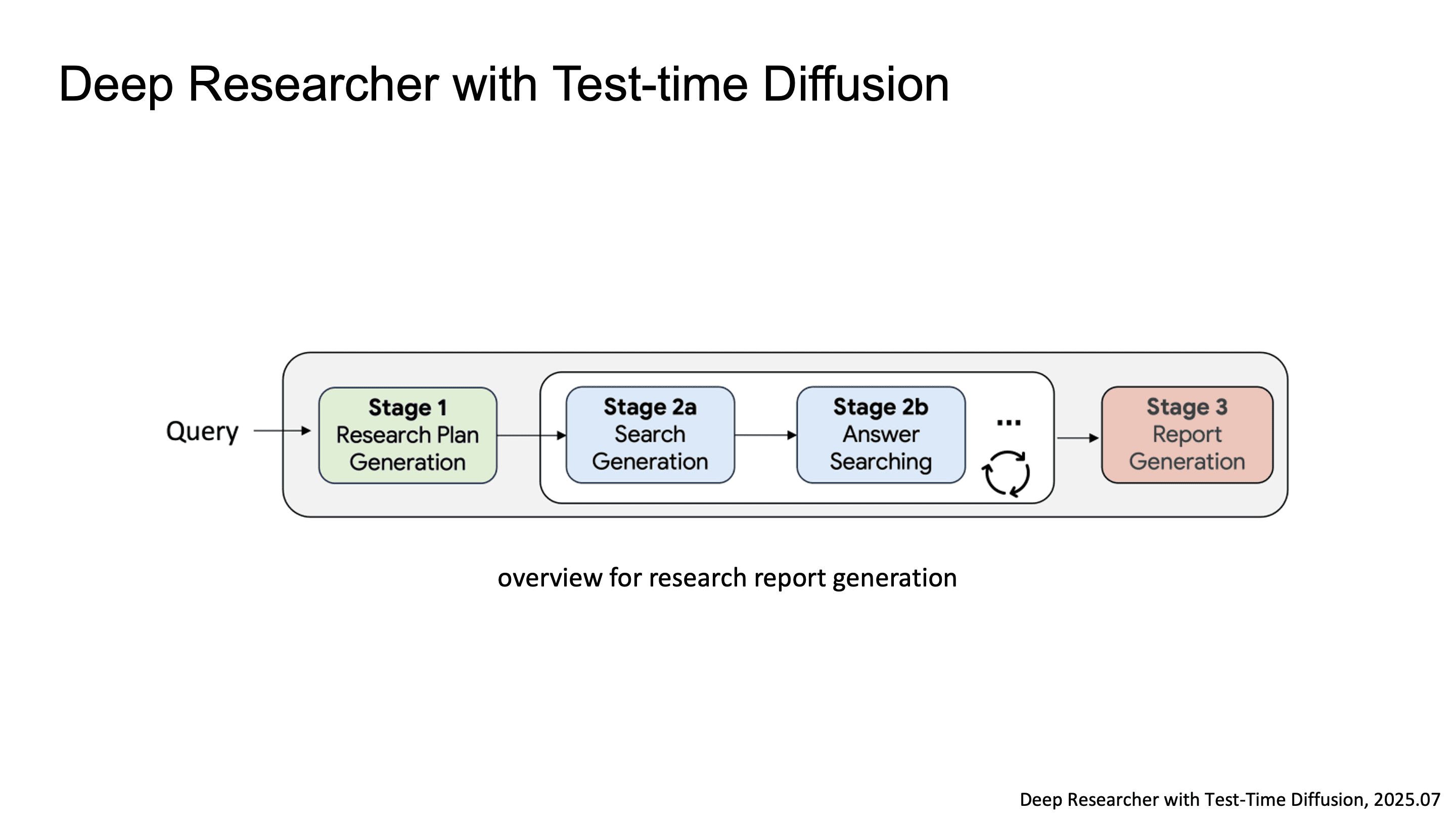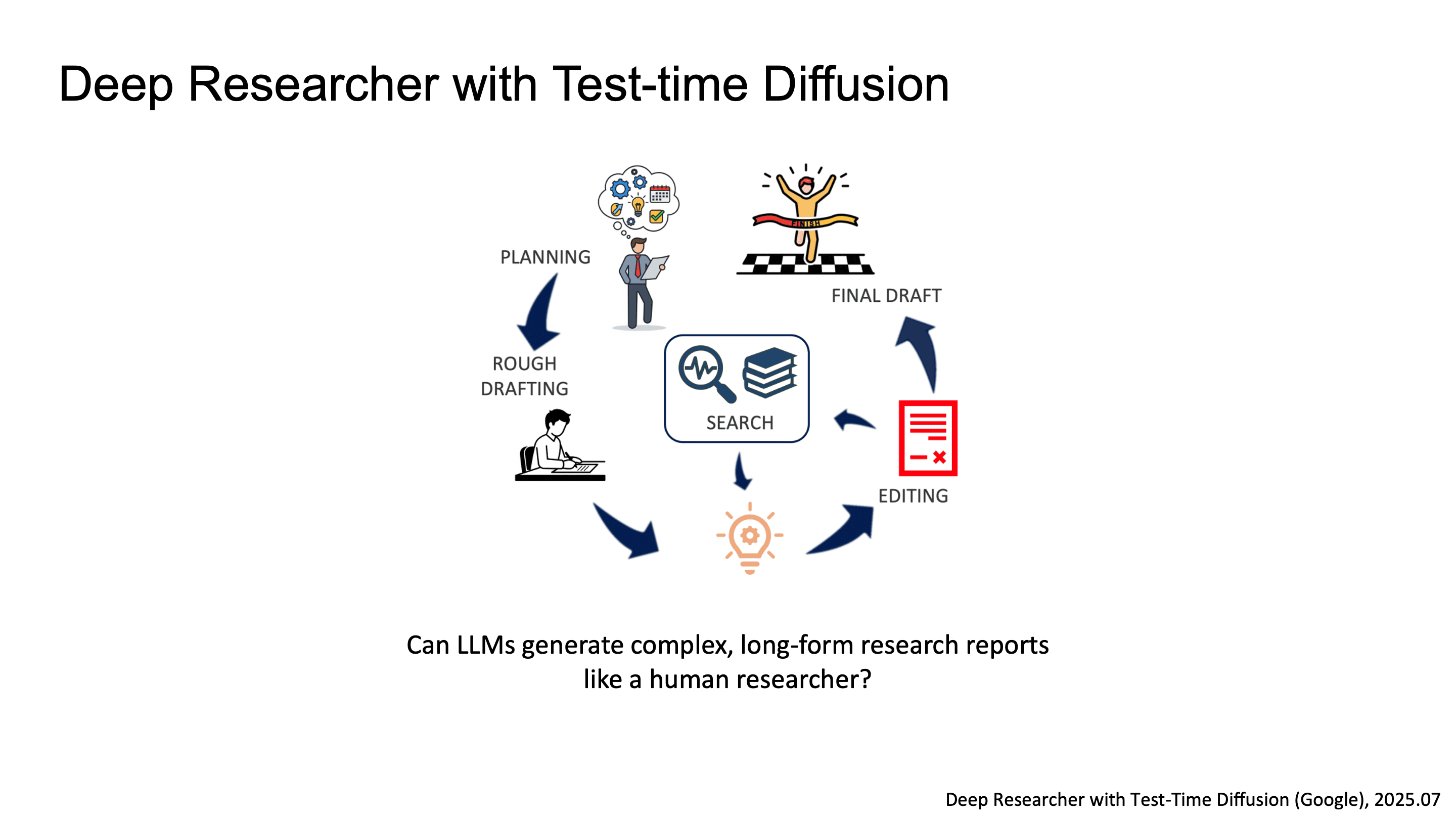 Google에서는 Deep Researcher with Test-time Diffusion 논문을 통해서 LLM이 human researcher 수준의 복잡한 long-form research report를 생성할 수 있는가를 연구한 결과를 발표했습니다.