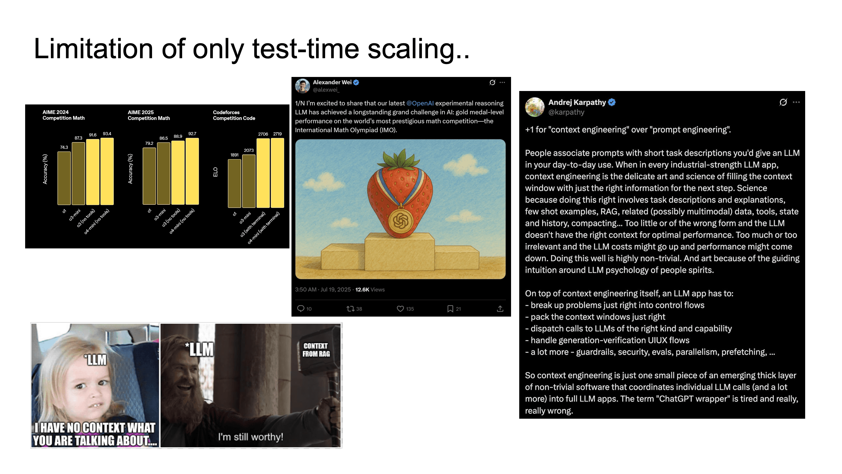Reasoning model은 IMO 금메달을 딸 정도로 발전했지만, 실제 태스크를 수행할 때 context가 없어서 제대로 수행하지 못하는 경우도 많았습니다. 그래서 context engineering, memory 등 LLM의 external capability를 부여하는 시도가 많아졌습니다.