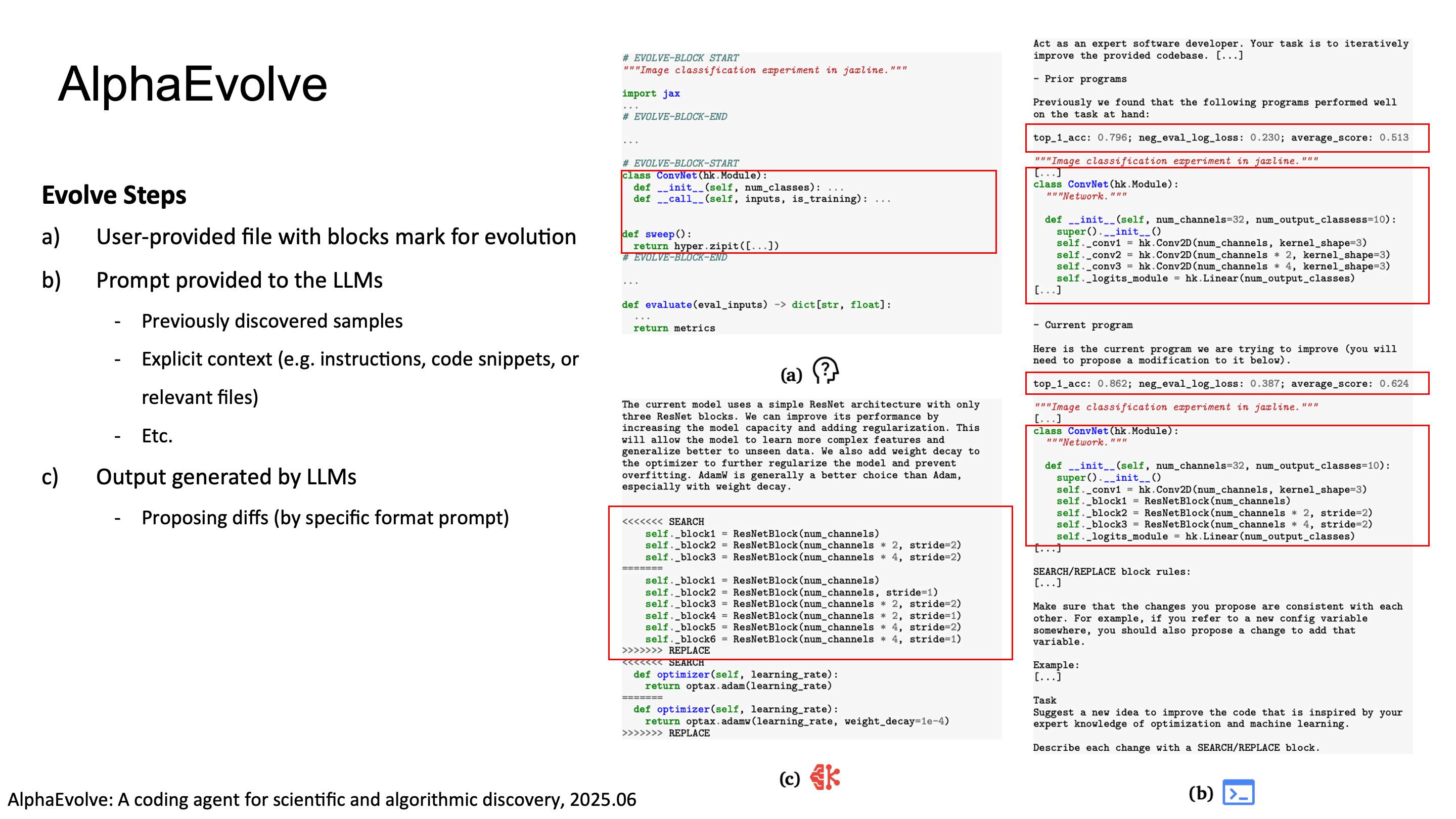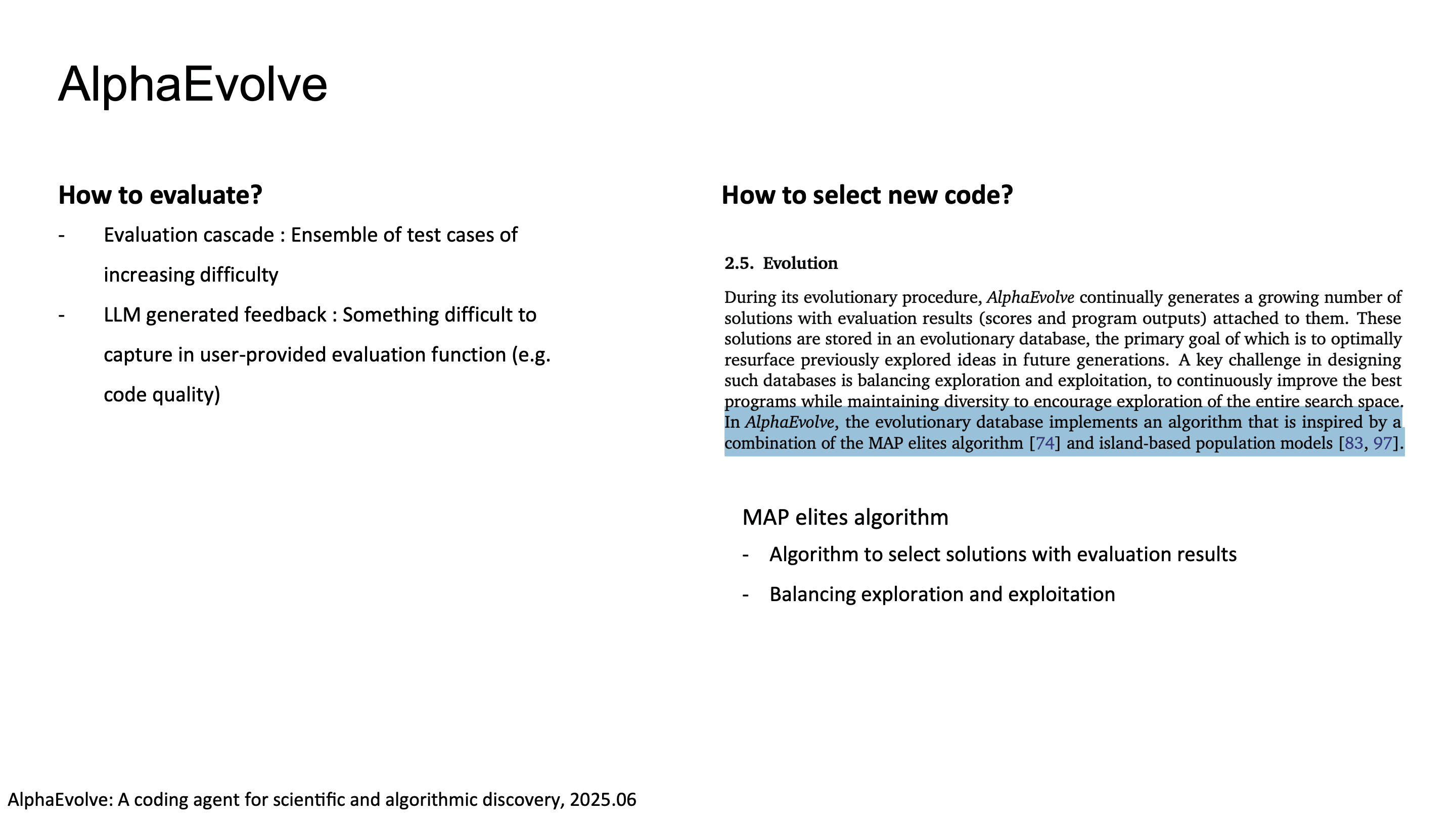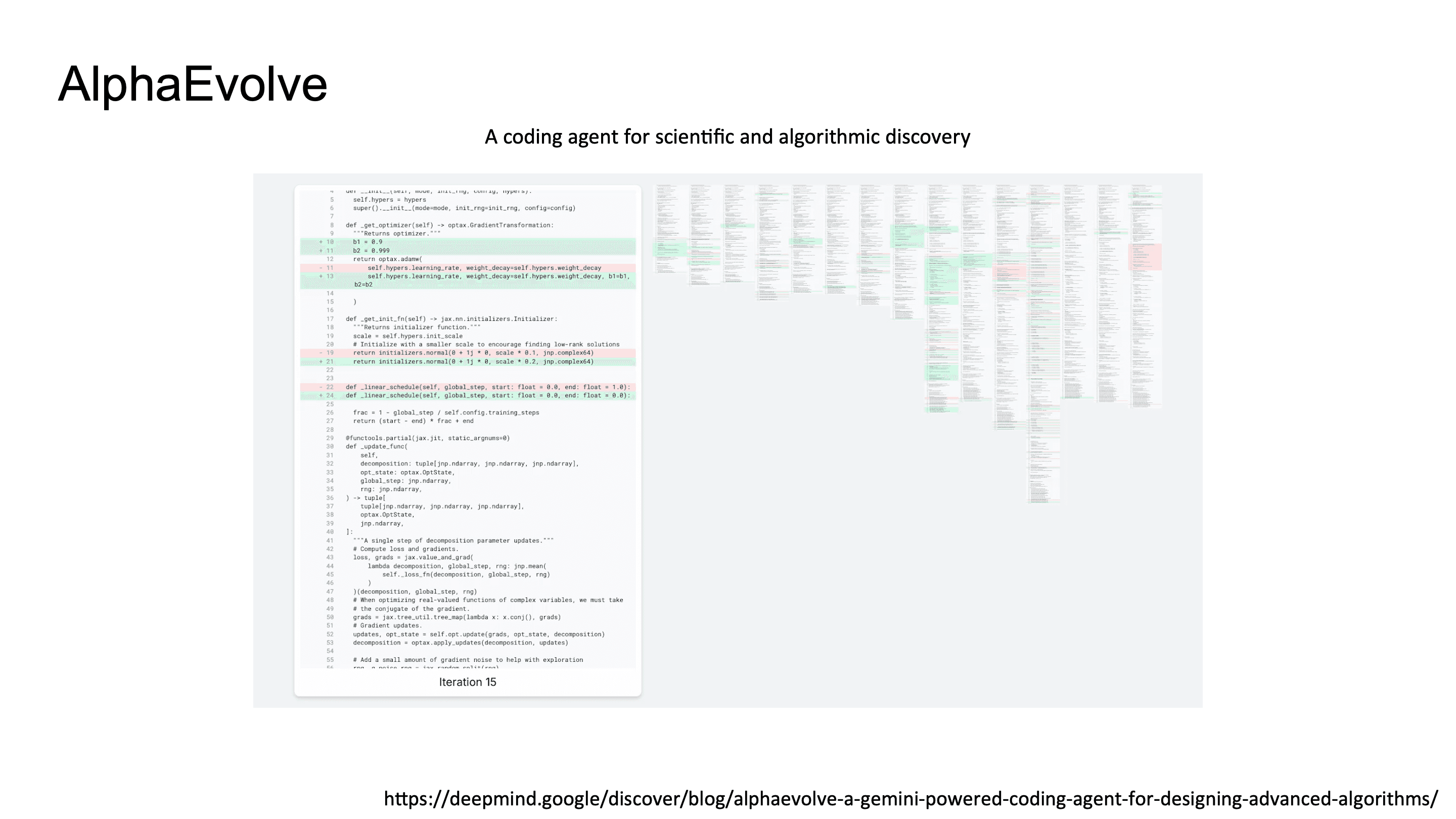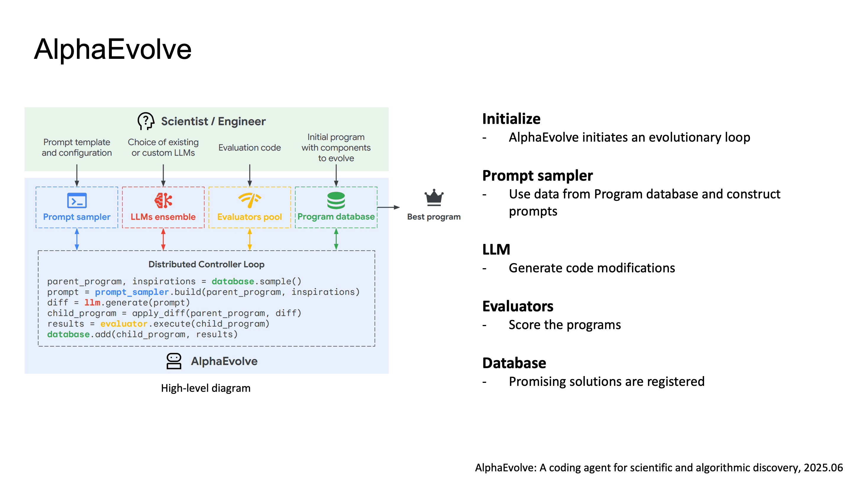 마지막으로 Google DeepMind의 AlphaEvolve입니다. AlphaEvolve는 algorithmic discovery를 위한 coding agent로, LLM과 evolutionary search를 결합한 구조입니다.
