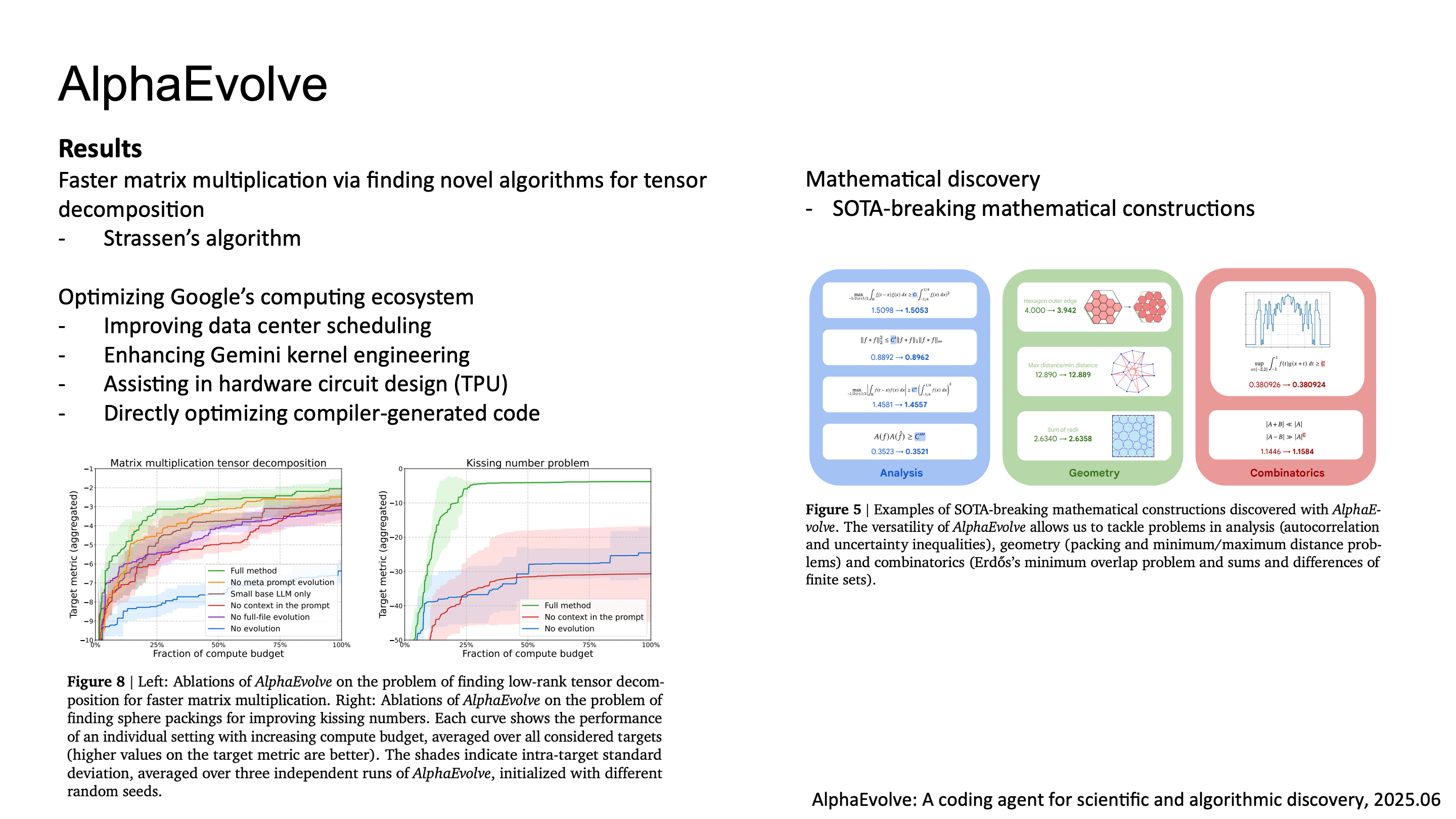 AlphaEvolve의 결과를 보면, 4x4 complex matrix multiplication을 위한 tensor decomposition에서 새로운 알고리즘을 발견했고, Google data center scheduling을 0.7% 최적화했으며, Gemini kernel engineering 개선, TPU circuit design에서의 Verilog 최적화, XLA compiler의 tile-size heuristic 개선했습니다.