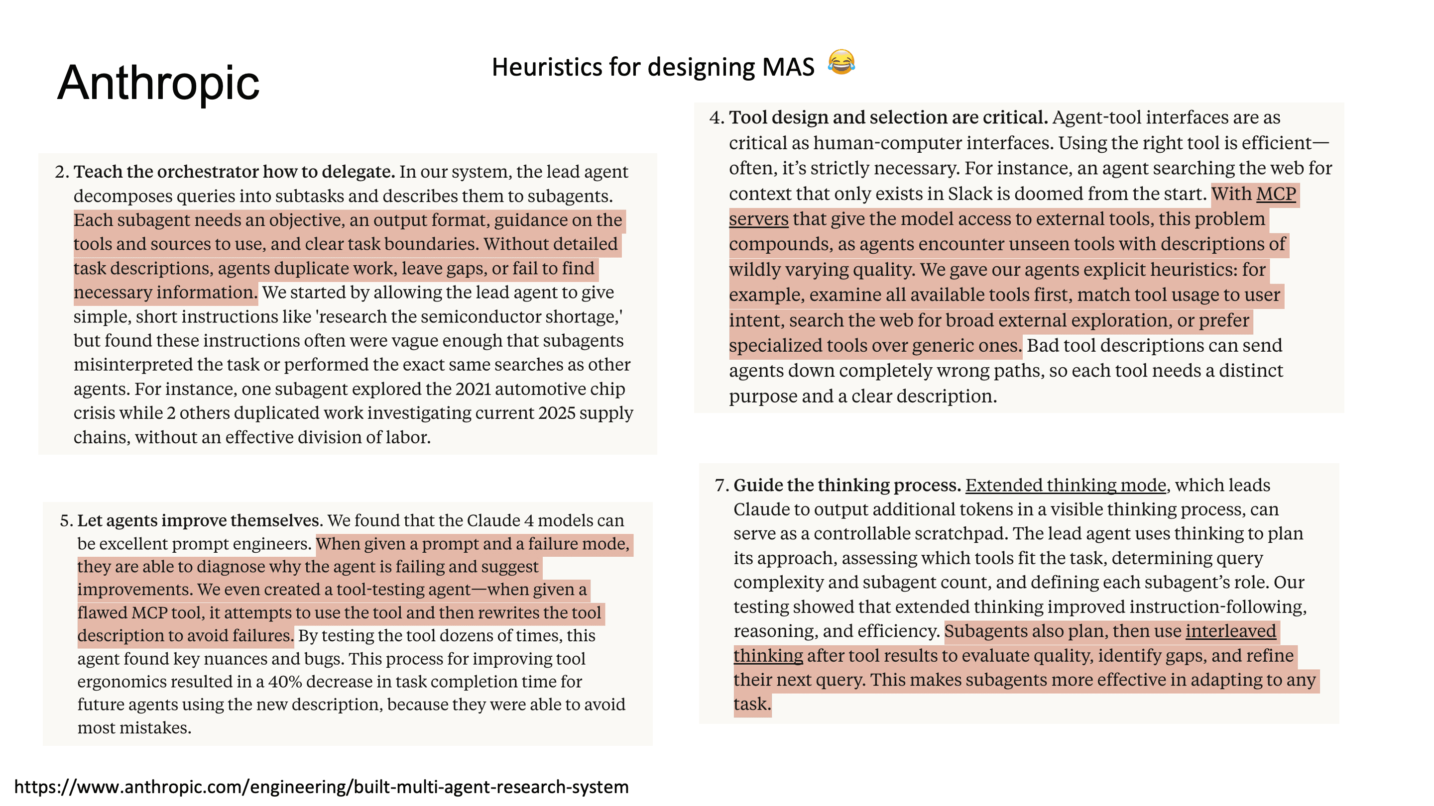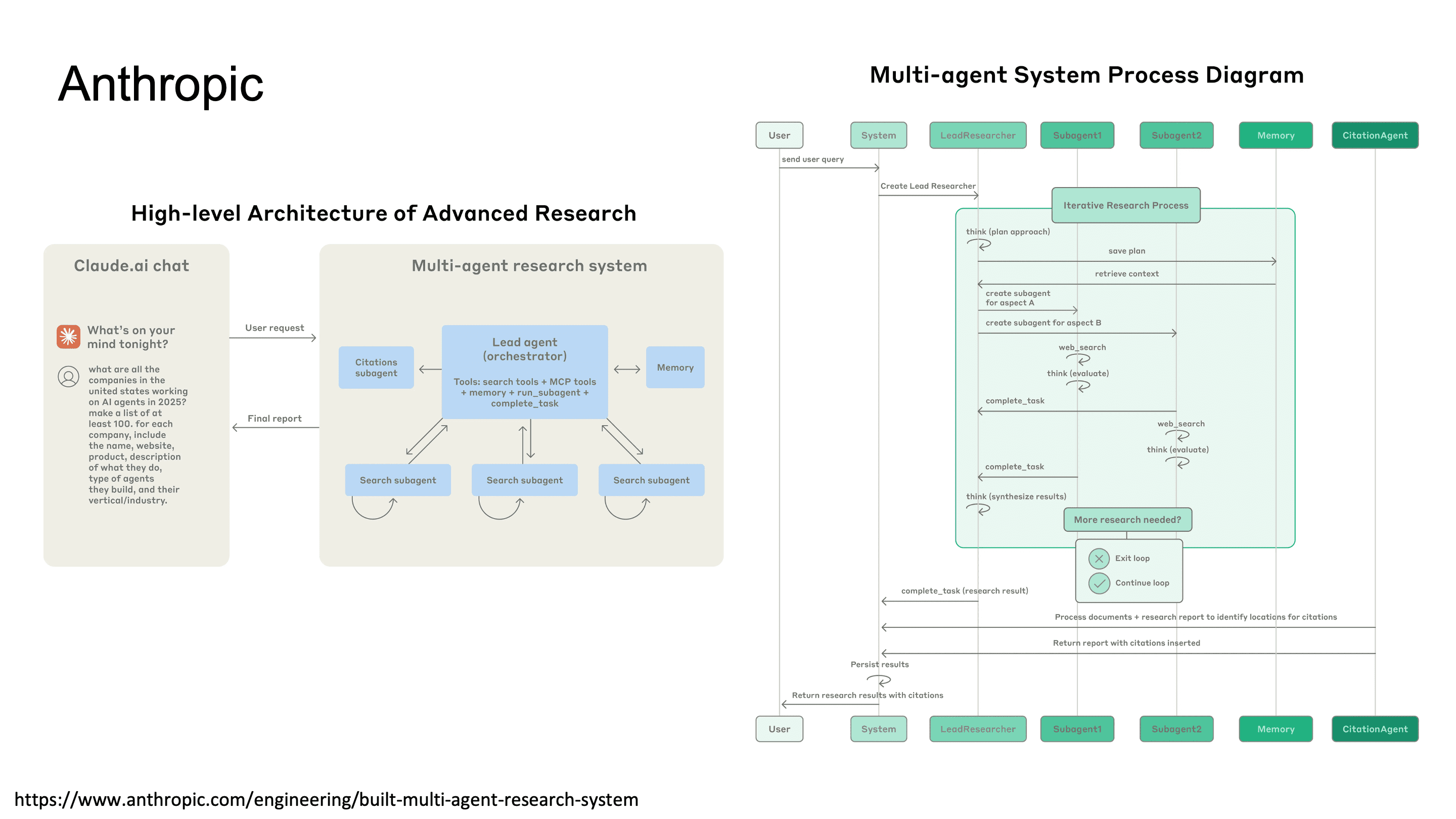 Anthropic은 자체 multi-agent research system 구축 경험을 공개했는데요. 재밌는것은 Anthropic이 task decomposition strategy, agent 간 communication protocol, result aggregation 방식 등을 실용적 관점에서 정리했습니다. 특히 agent에게 충분한 autonomy를 줘야 하지만, hallucination을 catch할 수 있는 verification loop가 중요하다고 합니다.