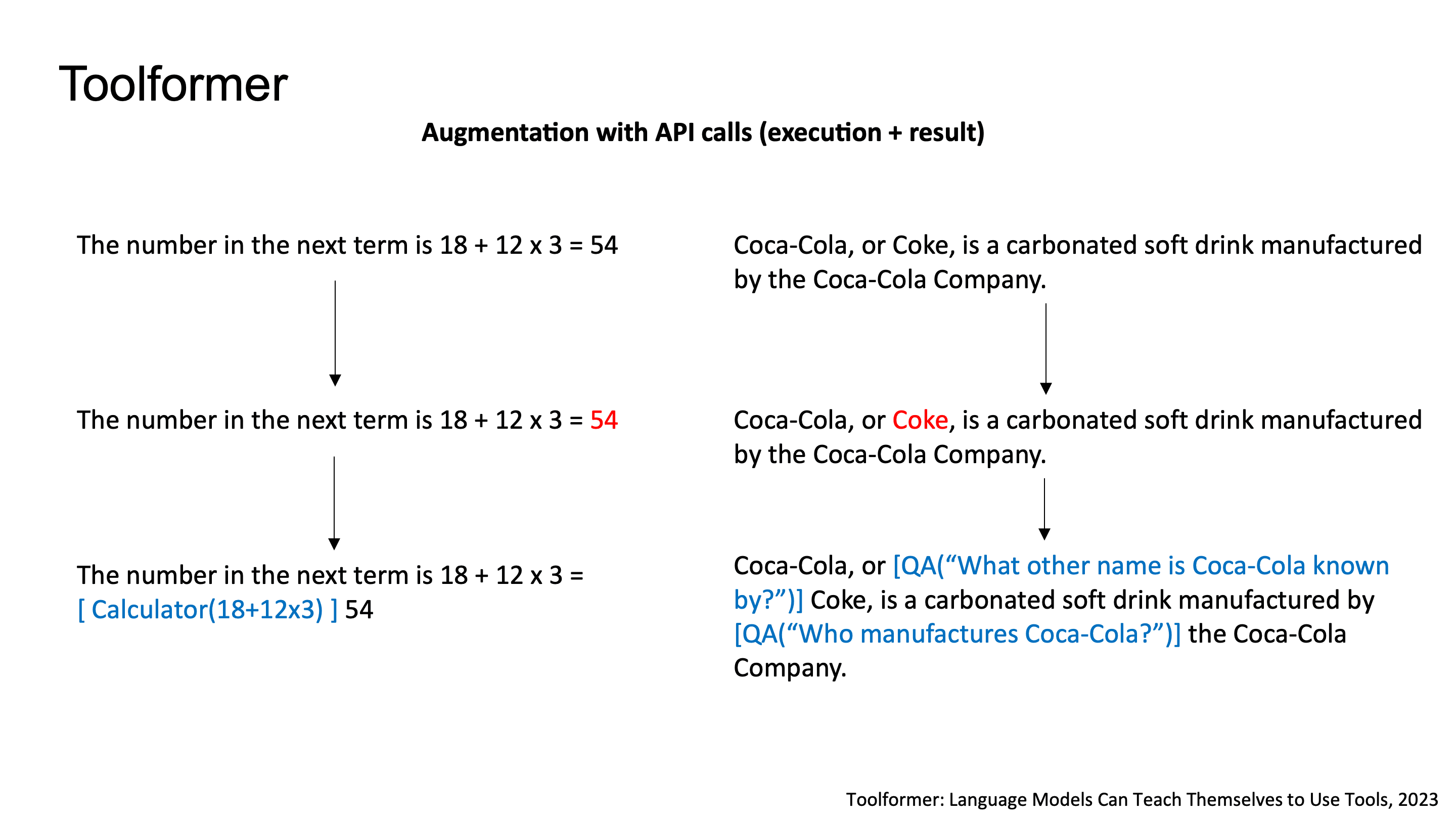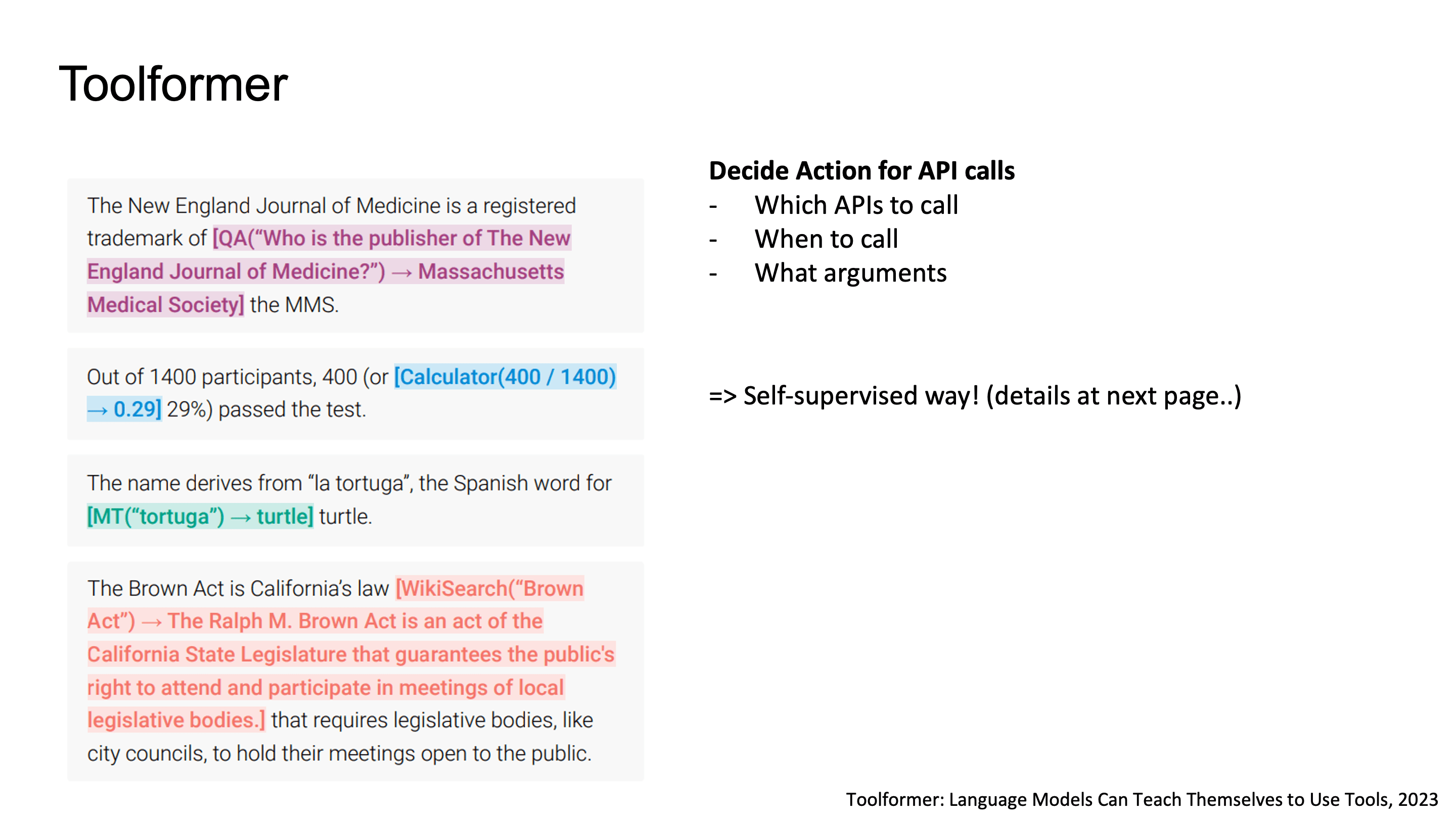 2023년에 나온 Toolformer라는 논문은 모델이 self-supervised 방식으로 API 호출의 위치, 종류, argument를 스스로 학습하도록 만들었습니다.