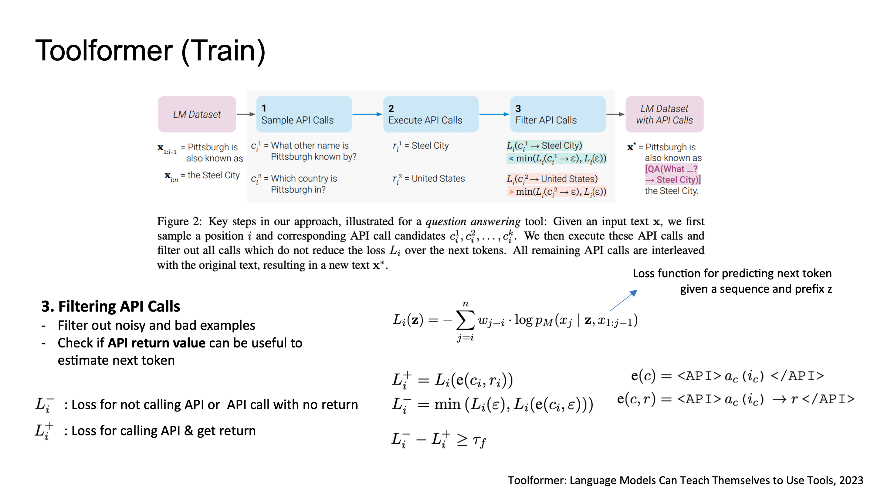 Filter API Calls: 학습 데이터를 만들기 전에 유용한 데이터만 필터링 하는 단계입니다. API 호출이 next token prediction에 실제로 유용한지를 cross-entropy loss로 검증합니다. API를 호출하지 않았거나 API response 값이 없을 경우의 loss와 API response를 넣었을 때의 loss를 비교해서, 차이가 τ 이상 날때만 학습 데이터에 포함시켜요. 즉, 유의미한 API response인 경우만 필터링해서 남긴다고 보면 됩니다.