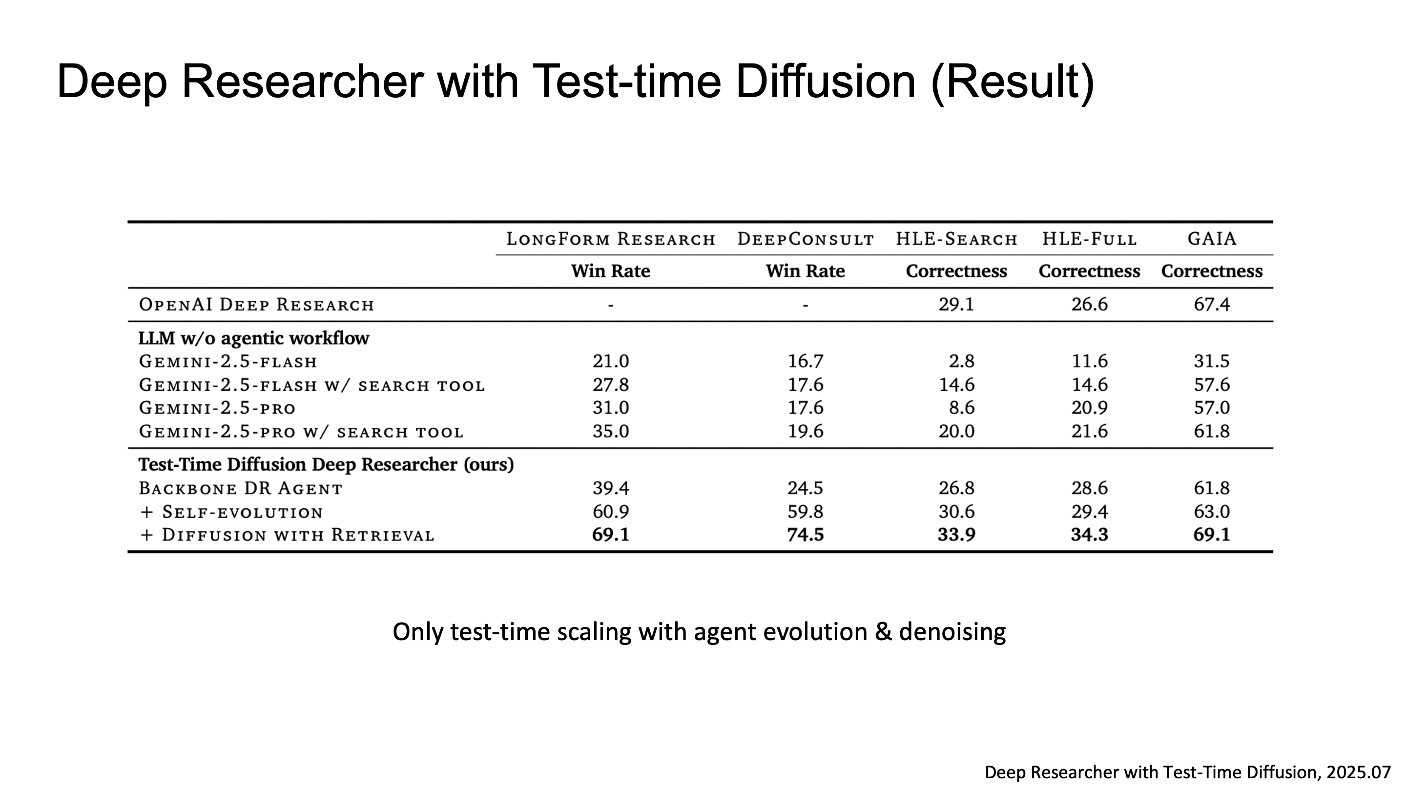 주목할 점은, 별도의 training 없이 pure test-time scaling, 즉 agent evolution과 denoising iteration만으로 이 성능을 달성했다는 겁니다.