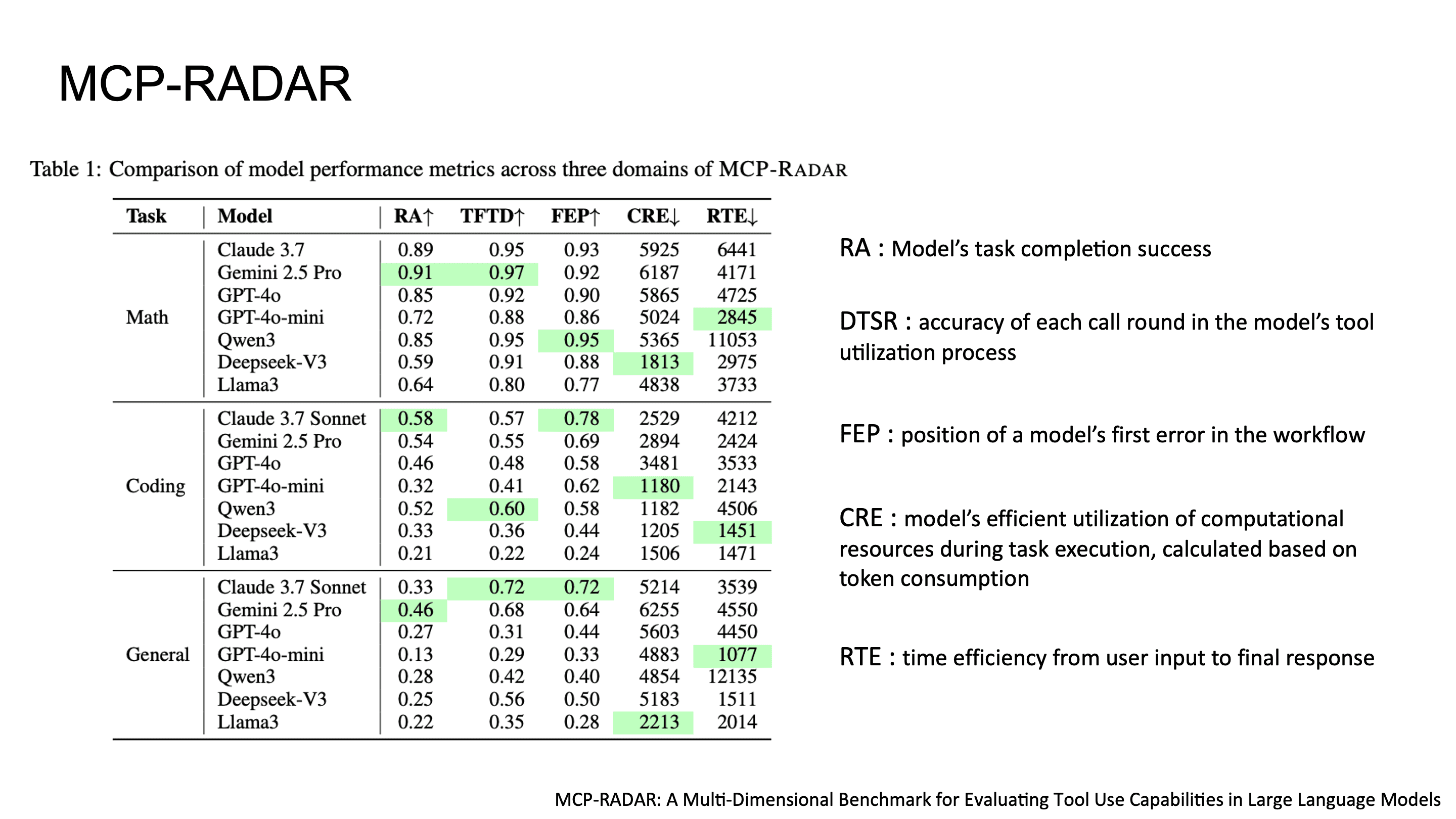 MCP-RADAR는 기존 benchmark들이 단순 accuracy만 봤던 한계를 넘어서, multi-dimensional evaluation을 제안한 벤치마크입니다.