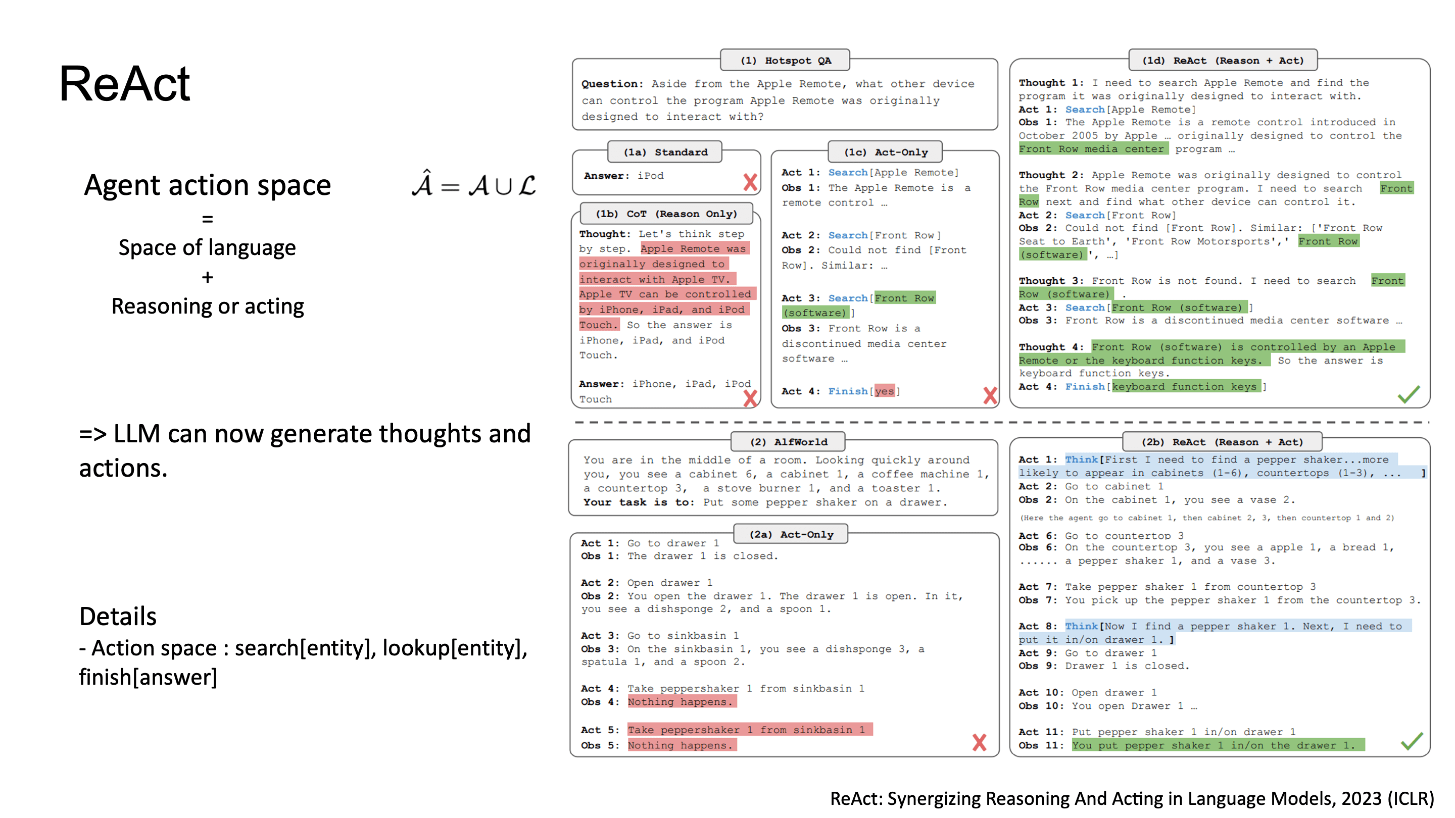 기존에는 reasoning trace와 action execution이 별도의 module이었지만, ReAct는 reason과 act 토큰을 하나의 시퀀스로 합쳤습니다.