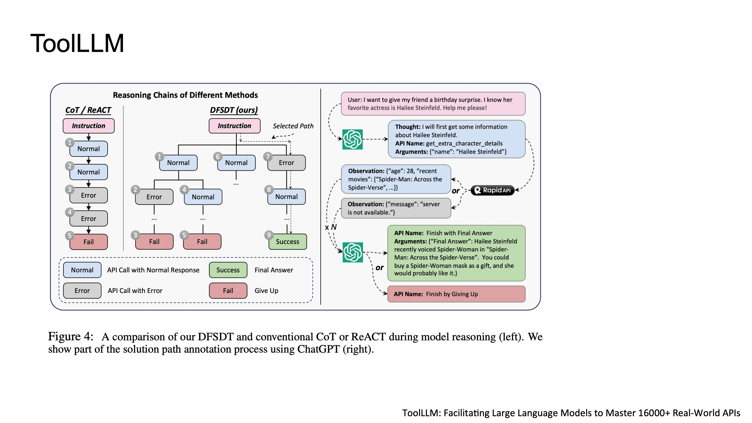 Toolformer가 일부 API로만 학습을 했다면, ToolLLM은 이걸 real-world scale로 끌어올린 연구입니다. RapidAPI Hub에서 16,000개 이상의 REST API를 수집하고, 이를 다룰 수 있는 instruction-tuned LLM을 만들었습니다. API Call이 성공한 결과를 받을 때까지 병렬적으로 API를 호출합니다.