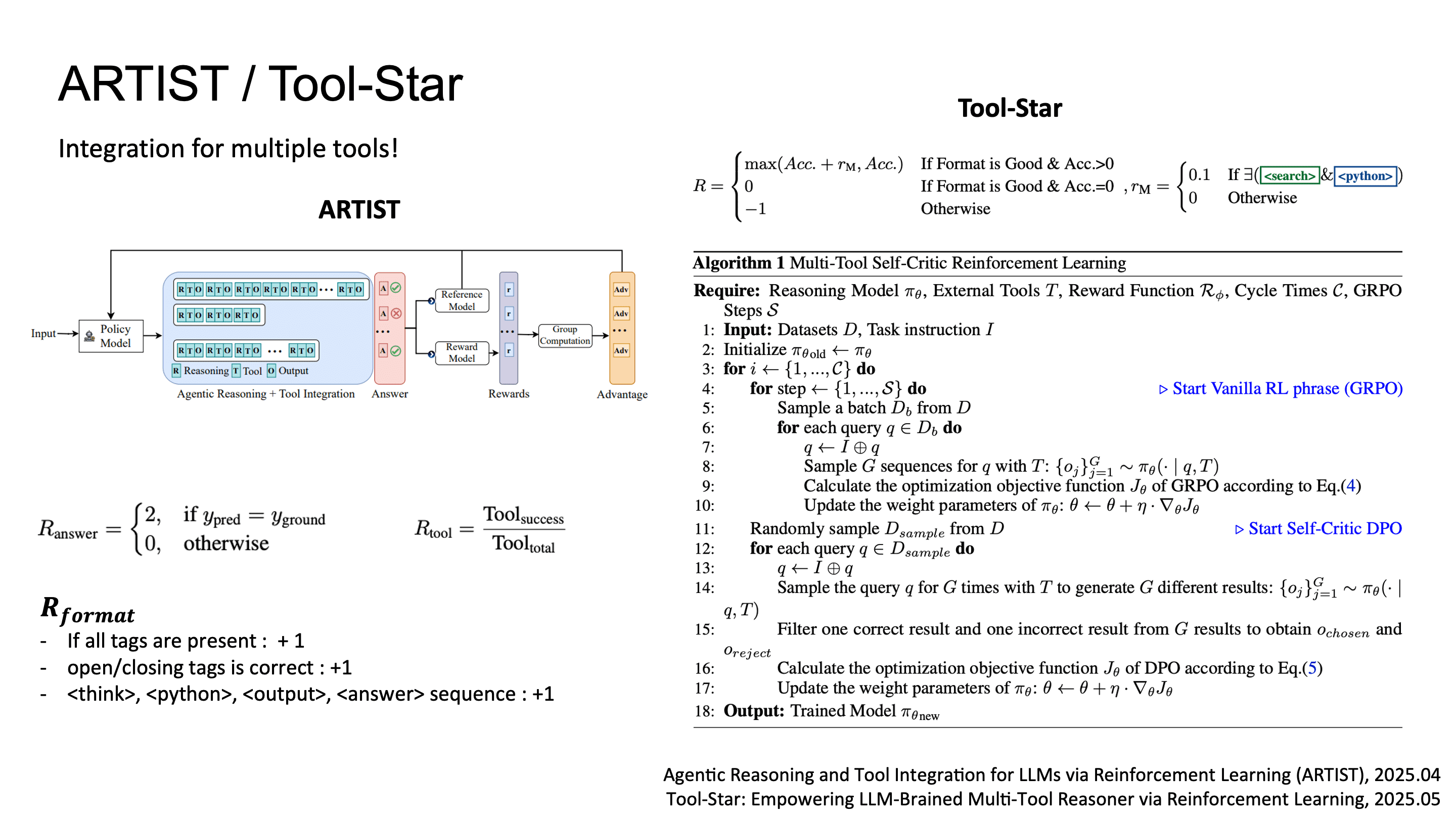 ARTIST와 Tool-Star와 같은 연구에서는 single-tool이 아닌 여러개의 tool 사용 사례를 위해 search, calculator, code interpreter 등 heterogeneous tool set을 RL로 joint optimization하는 framework를 제시했습니다.